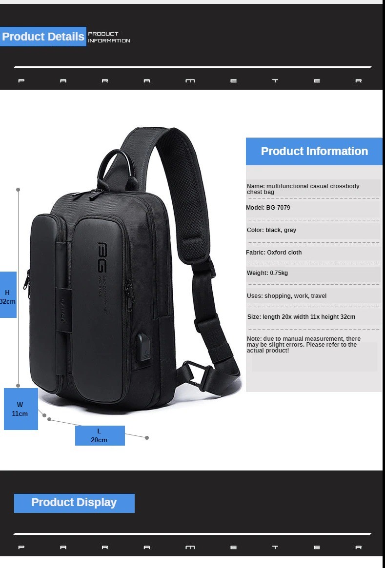 Túi balo nam đeo chéo đa năng BG-7079 có thiết kế đậm chất nam tính, thời thượng, phong cách street life năng động cá tính. Chất liệu cao cấp chống nước bền bỉ.